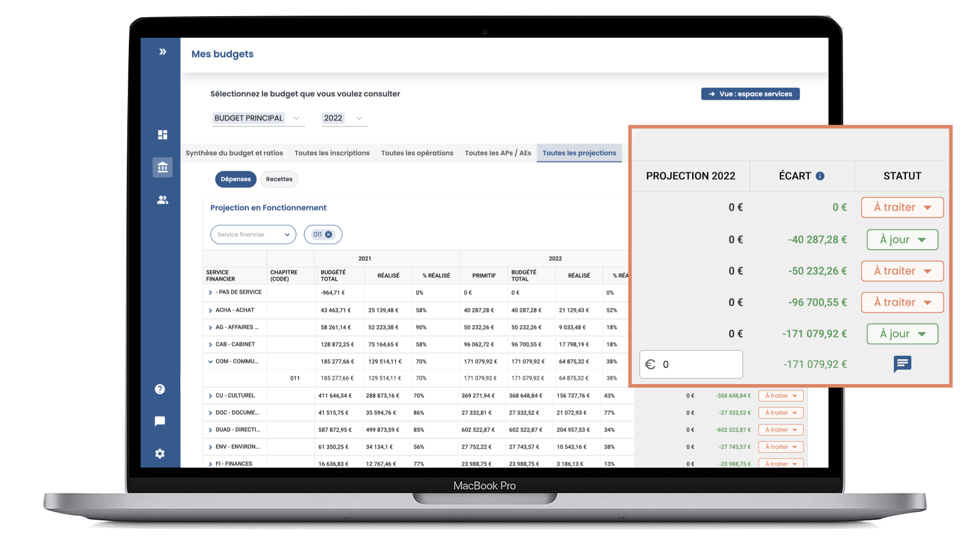 Dans cet espace dédié, les services saisissent leurs projections. L’écart entre les projections et le montant budgété se met à jour automatiquement.