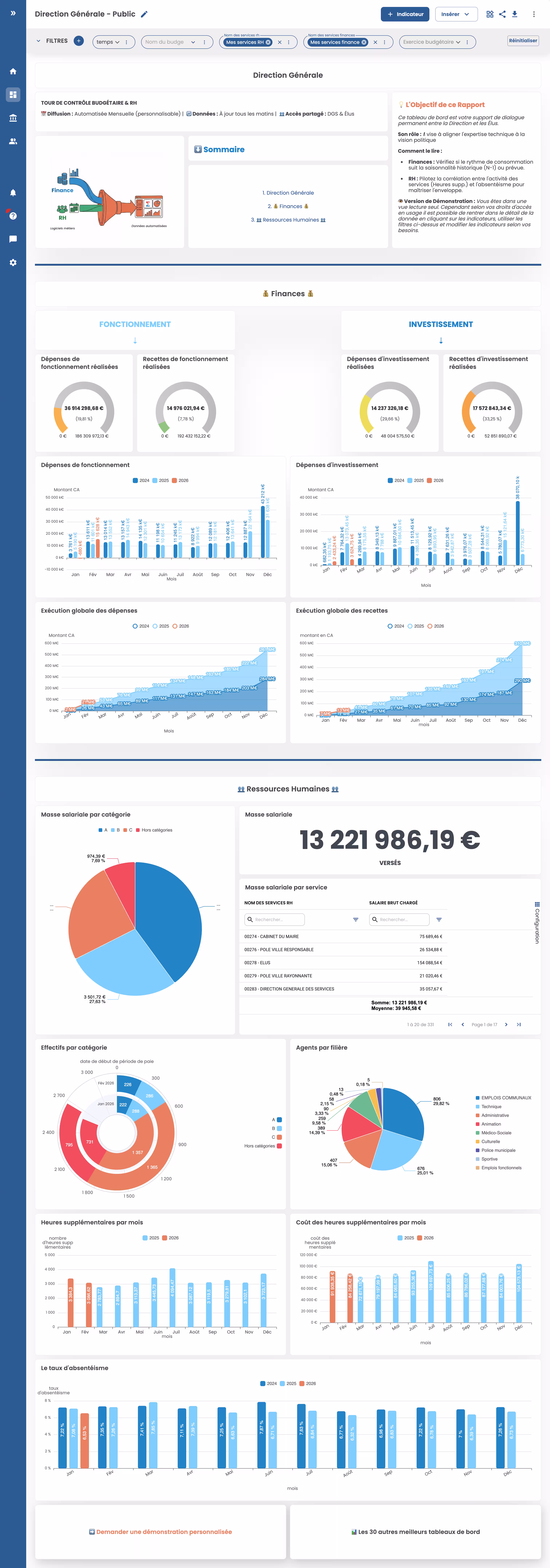 L'essentiel des données financières et RH : exécution budgétaire, investissements, suivi des effectifs, absences ...